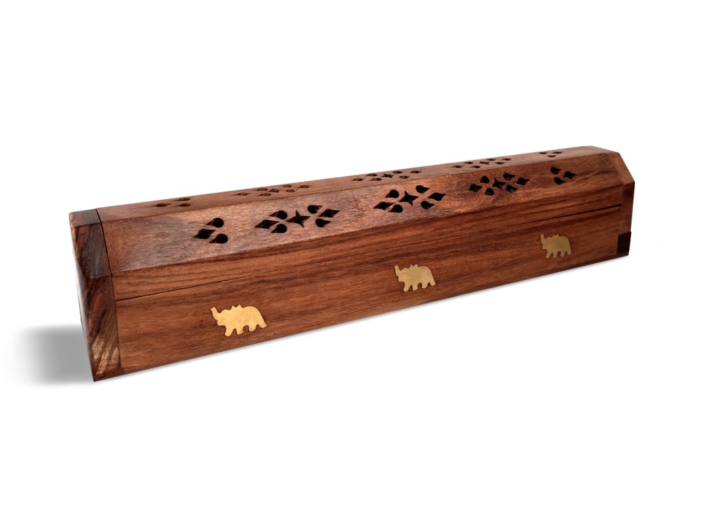 Predstavujeme vám nielen praktický, ale aj umelecky spracovaný uzatvárateľný drevený stojan z indického palisandra, ktorý je ideálny na zachytávanie popola padajúceho z vonných tyčiniek, vďaka čomu minimalizujete neporiadok okolo. Táto nádherná truhlica je pôsobivou dekoráciou a zároveň bezpečným útočiskom nielen pre vonné tyčinky, ale aj vonné kužele - františky. Zdobí ju precízna rezba a mosadznými slonmi, ktorá je príjemným dozdobením samotného stojana aj vášho domova a vnesie doň nádych exotiky a elegancie.